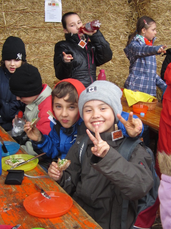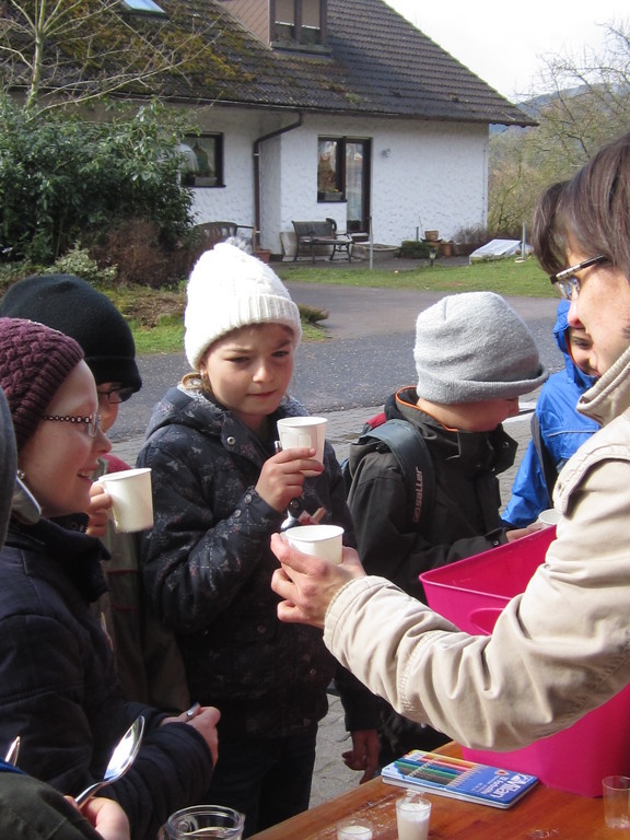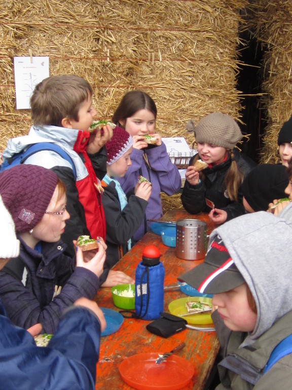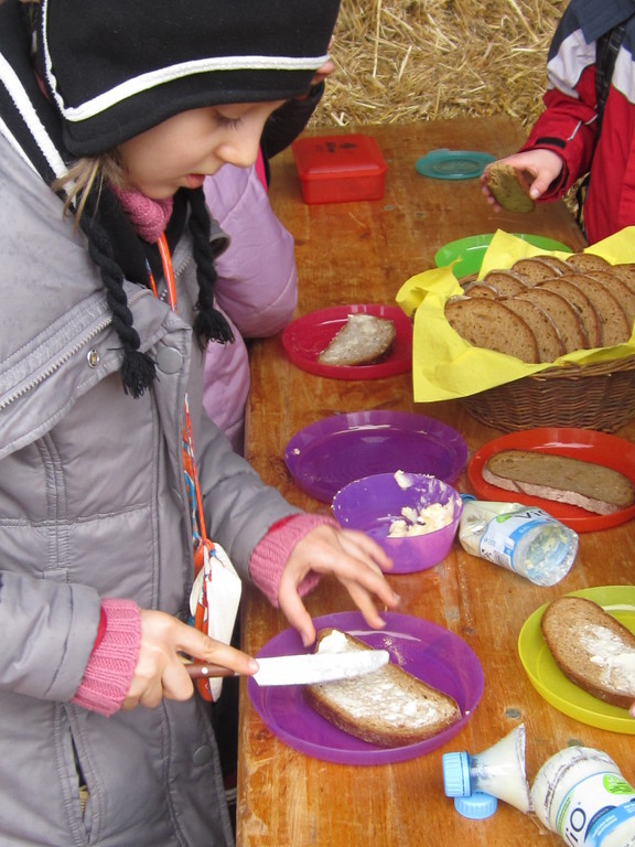 Zum Abschluß des Projkettages durften die Schüler ihre Butter für das Butterbrot selbst herstellen - was allen viel Freude bereitete, denn dies wurde mit einem kleinen "Wettkampf" ausgetragen. Mit frischen Schnittlauch aus dem Garten schmeckte das Butterbrot nochmal so gut.